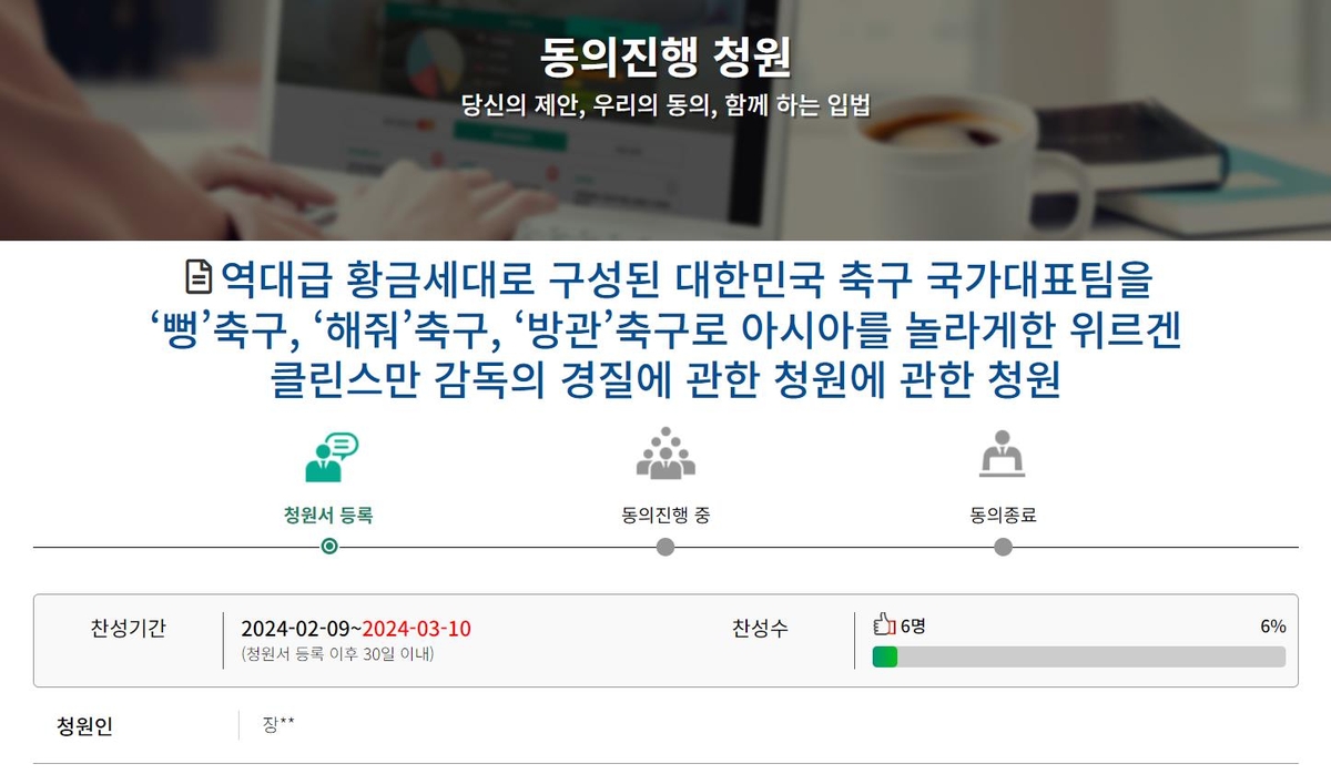 2023년 아시아축구연맹(AFC) 아시안컵에서 한국 축구 대표팀이 64년 만의 정상 탈환에 실패한 후, 위르겐 클린스만 독일 감독의 경질을 요구하는 국민동의청원이 등장했습니다.