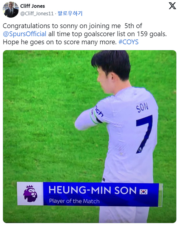 존스는 손흥민이 토트넘 유니폼을 입고 159번째 골을 넣은 11일(한국 시각)의 경기 후, 개인 트위터를 통해 손흥민이 경기 최우수 선수로 선정된 모습을 담은 방송 캡처 사진과 함께 “쏘니, 토트넘 통산 159골을 넣어 나와 함께 5위에 오른 것을 축하한다. 앞으로 더 많은 골을 넣기를 바란다”고 전했습니다.