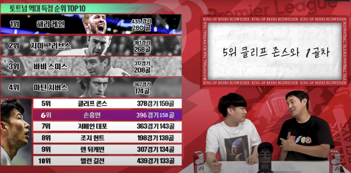 2위는 ‘전설’ 지미 그리브스(381경기 268골), 3위는 바비 스미스(317경기 208골), 4위는 마틴 치버스(367경기 174골)입니다. 현재 손흥민은 4위에 위치하며 15골 차이로 기록되어 있습니다. 현재의 속도를 유지한다면 다음 시즌에는 이 기록을 뛰어넘을 수 있을 것으로 보입니다.