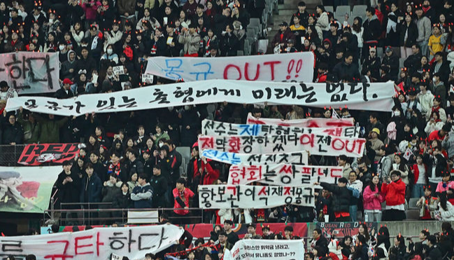 경기가 진행되면서도 한국 팬들의 분노는 가라앉지 않았습니다. 정몽규 회장을 향한 비난은 계속되었고, 성난 팬들은 정몽규 나가를 외치며 분노를 표출했습니다.
