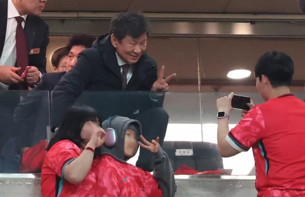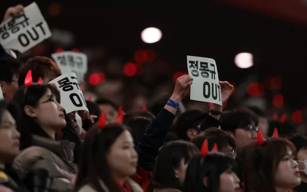 이날 경기 시작 전, 한국 응원석에서는 킥오프 직전에 정몽규 대한축구협회(KFA) 회장에 대한 비판이 폭발했습니다. 경기장을 가득 메운 붉은악마들은 애국가가 울려 퍼지는 가운데 대형 태극기를 높이들며 정몽규 회장을 향해 비난의 목소리를 냈습니다. 잠시 후, 태극기가 사라진 자리는 정몽규 회장을 비판하는 플래카드로 가득 찼습니다.