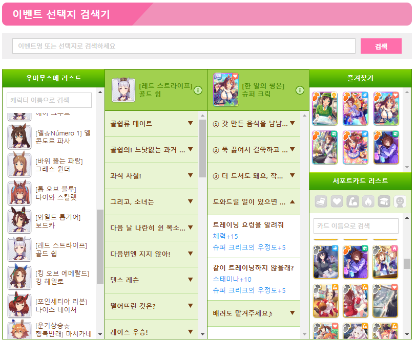 [이벤트 검색기]에 육성시 사용하는 [서포트카드]를 즐겨찾기 등록하고 보면서 플레이하시면 되무니다!