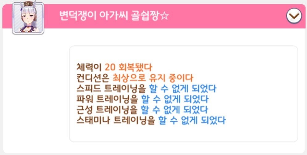 무지성 육성이 가능하기 때문인데요. 스피드만 훈련하고 체력없으면 휴식. 이것을 반복하면 우마뾰이를 볼 수 있습니다.