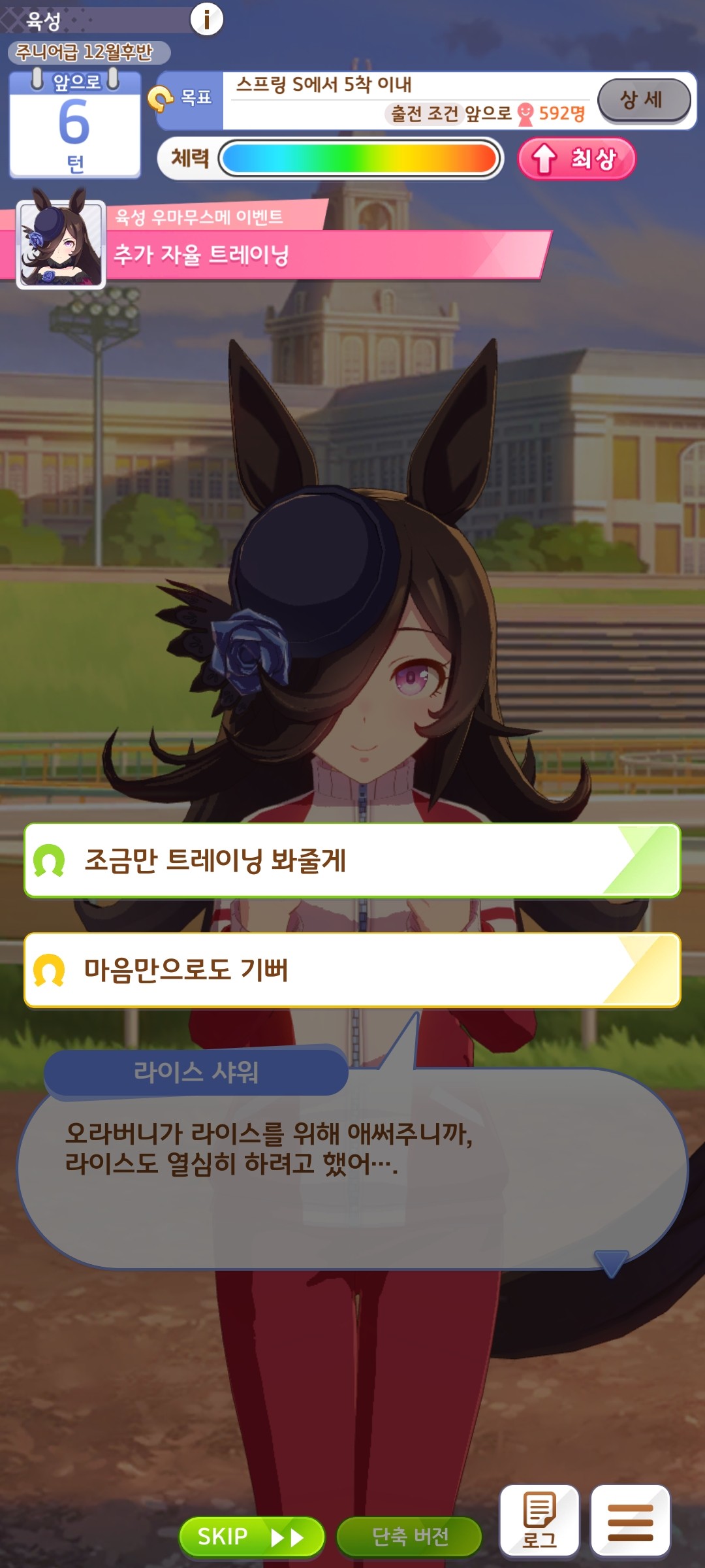 그리고 직전 트레이닝에 함께한 서포트카드의 인연게이지를 올려줍니다. (초반에는 무조건 위쪽 선택지) 아래 선택지는 체력을 5 회복합니다.