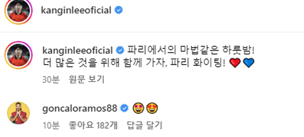 루이스 엔리케 PSG 감독으로선 이보다 더 좋을 수 없는 경기다. 음바페, 콜로 무아니, 하무스 등 공격수들이 고른 활약을 펼쳤을뿐 아니라 미드필더 이강인이 데뷔골을 터뜨렸습니다. 이강인은 경기 후 SNS에 “파리에서의 마법같은 하룻 밤! 더 많은 것을 위해 함께 나아가자. 파리 파이팅!”이라고 소감을 남겼습니다. 하무스가 빠르게 이강인 SNS를 찾아와 ‘눈 하트 뿅뿅’ 이모지를 달았다. 새로운 ‘케미’가 폭발할 조짐입니다.