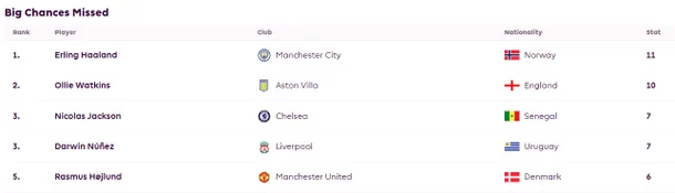 현재까지 홀란은 리그에서 가장 많은 골을 터트렸지만 그만큼 찬스도 많이 놓쳤습니다. 홀란은 현재 빅찬스 미스 11회로 프리미어리그 선수들 중 1위를 기록 중입니다. 손흥민과 함께 득점 공동 2위에 올라와 있는 살라는 결정적인 찬스를 2번 놓쳤습니다.