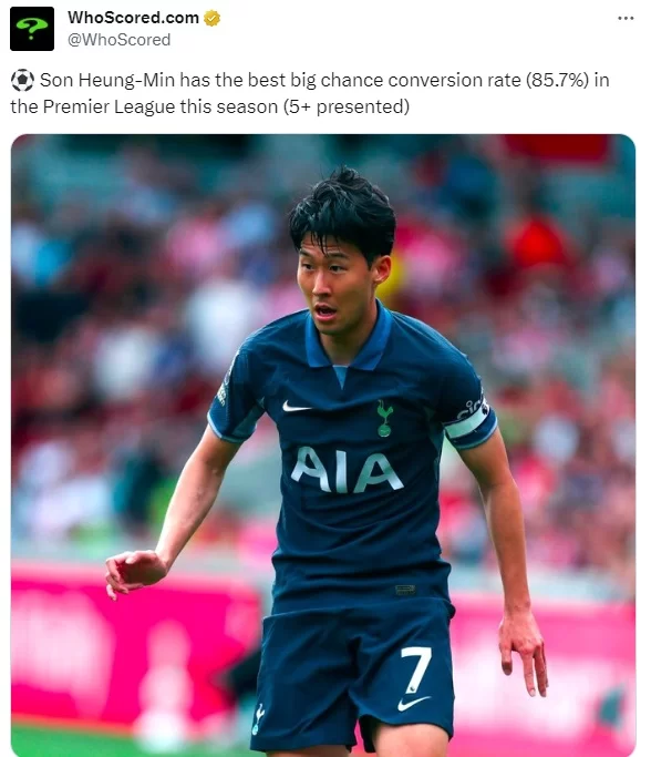 축구 통계매체 ‘후스코어드닷컴’은 31일(한국시간) SNS을 통해 “손흥민은 이번 시즌 프리미어리그에서 가장 높은 빅찬스 전환율(85.7%)를 기록했다”라고 설명했습니다.