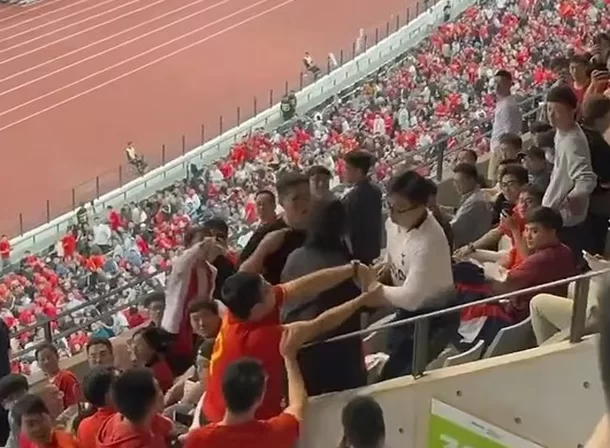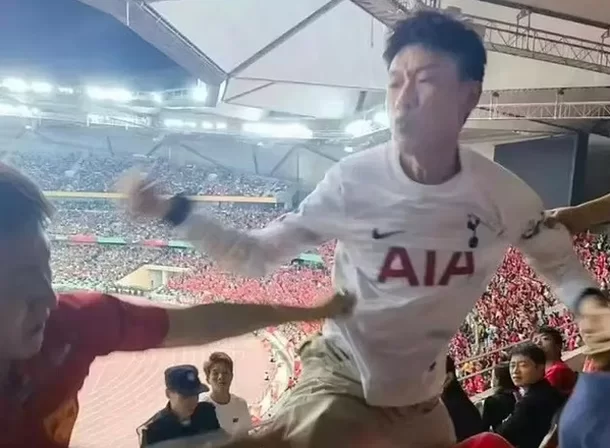 중국 유니폼을 입은 팬들이 한두명씩 토트넘 유니폼을 입은 팬에게 몰려들었고 몸싸움에 이어 주먹질까지 이어졌습니다. 토트넘 유니폼을 입은 팬은 중국팬들로 인해 관중석에서 끌려 나왔고 한국에 완패를 당한 중국의 팬들은 토트넘 유니폼을 입은 팬에게 화풀이를 했습니다.