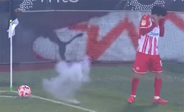 상황은 이렇습니다. 전담 키커인 황인범은 코너킥을 차기 위해 코너 플랙 근처로 향했습니다. 그곳에서 코너킥을 준비하는 과정에서 관중석 어디선가 폭죽이 날아들었습니다. 황인범이 폭죽에 맞았는지는 확인되지 않지만, 오른손을 오른쪽 귀에 갖다댄 걸 보면 충격이 가해진 것으로 보입니다.