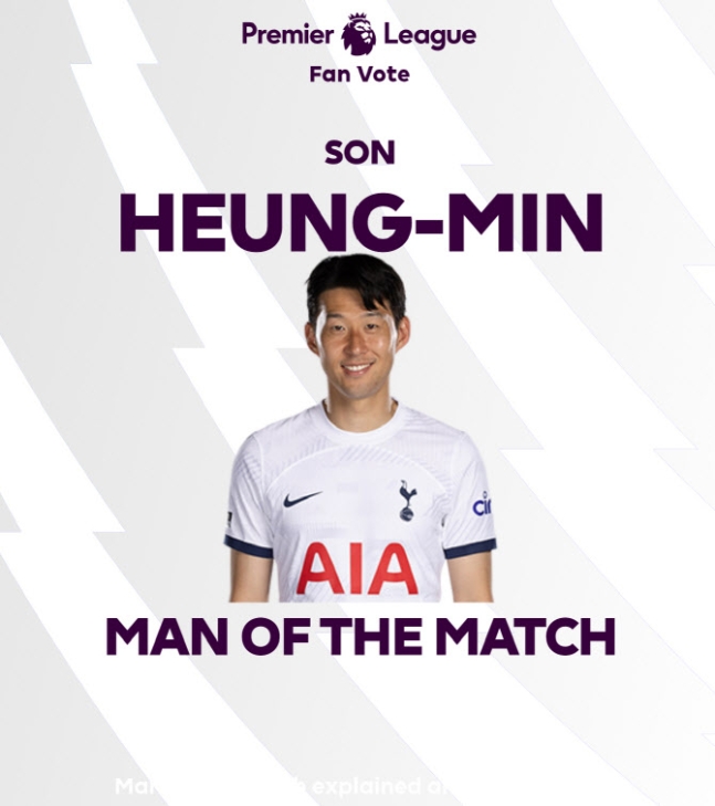 손흥민은 경기 후 EPL 사무국이 팬 투표로 선정하는 MOM에 선정됐습니다. 경기 후 팬투표에서 74.6%라는 압도적인 지지를 받았습니다. 손흥민이 경기 MOM에 뽑힌 것은 이번 시즌에만 벌써 8번째입니다.